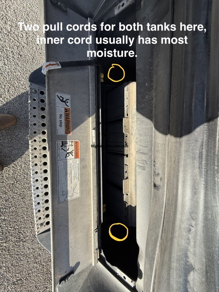Note there are two pull cords up front of battery compartment for the two tanks under driver. Then a third pull cord in back for rear, the front inner tank usually has the most moisture. Three in total to drain on my 2024 Freightliner Cascadia.